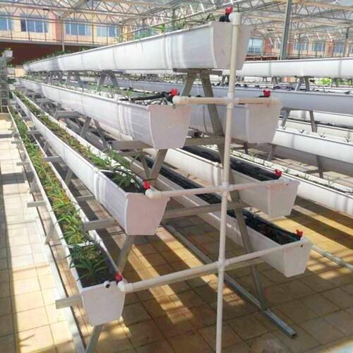 3.三层槽式:将三层木槽按一定距离架于空中,营养液顺槽的方向逆水层流动。主要适用于草莓的种植