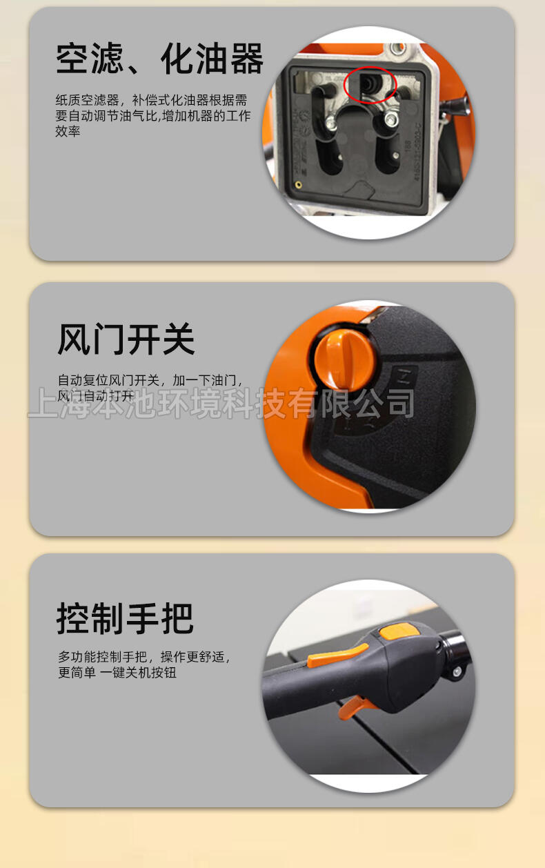 3、操作时右手握紧操作手柄,左手在把手上自然握住,手臂尽量伸直。机器与地面构成的角度不能超过60°,但角度也不能过低,否则也不易操作。
