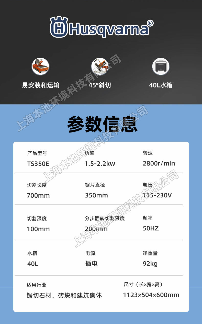 Husqvarna富世华/胡斯华纳TS350E台式切割机,台式石板混凝土砖块切割机。插电式设计,1.5-2.2KW大功率切割机。台式切割锯可随意移动。安装方便。简单易操作。适用于多种石板,瓷砖,石块等型材切割。