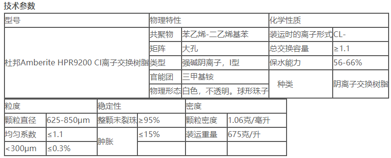 杜邦Amberite HPR9200 CI离子交换树脂具有优异的耐温性,高操作能力,高再生效率,长使用寿命,优异的化学稳定性,高耐有机污染性,优异的耐磨性,高极性物质和树脂颗粒。 可吸收药物净化,水处理中碳酸硬度的去除,抗生素净化,食品和有机化学净化以及均质性等特性,主要用于各种工业领域。