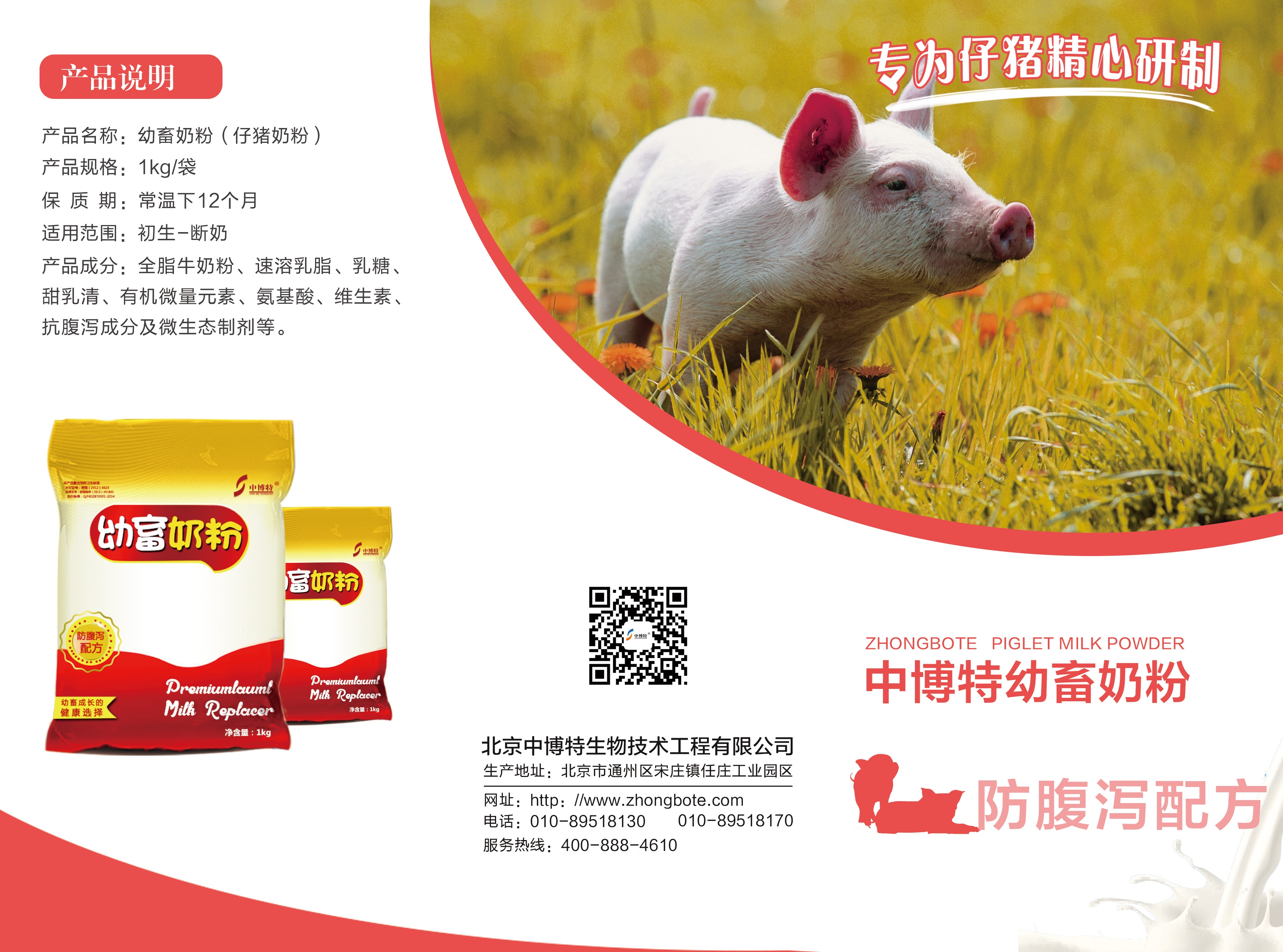 北京中博特生物技术工程有限公司是一家专业从事研究幼小动物奶粉和牛羊预混料的高新技术企业,公司主要产品有羔羊奶粉、犊牛奶粉、仔猪奶粉、狐貉貂奶粉、4%牛羊预混料和5%牛羊预混料等。其中仔猪奶粉主要适用于仔猪,充分补充乳仔猪所需的各种营养,有效防止乳猪腹泻,提高乳猪免疫抗病力,快速促进乳猪生长。
