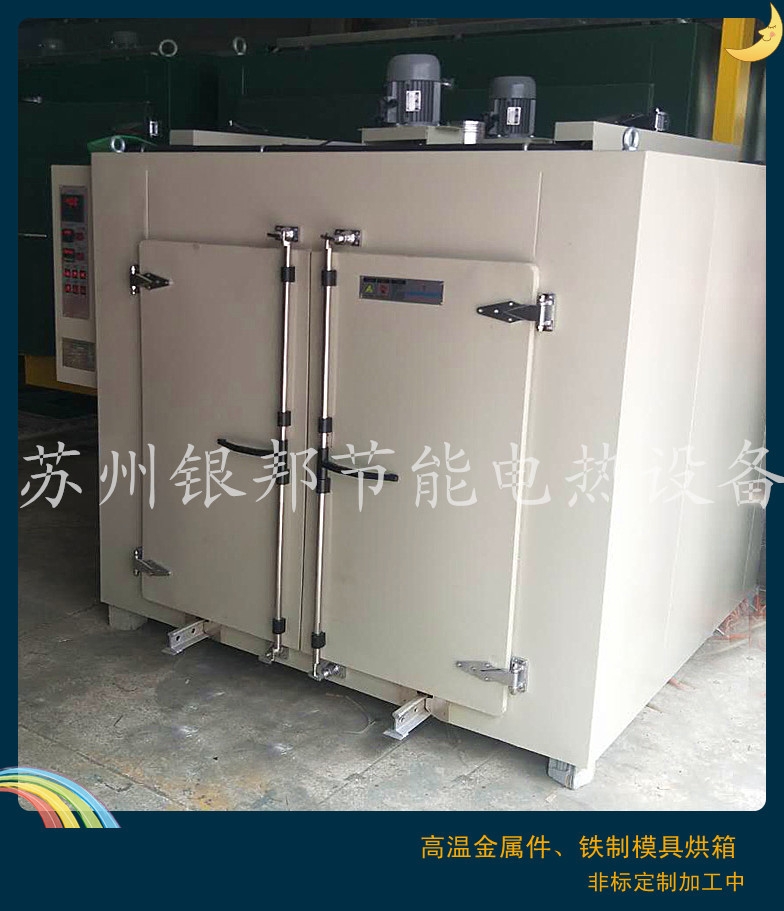 苏州银邦热风循环400℃高温烘箱适用于:金属件除氢驱氢、五金件清洗烘干、金属件铝件预热、金属件回火加热、汽车零部件热处理、金属件焊接后回火、承重型金属件加热等等。本产品采用电热鼓风设计方式,升温时正常加热功率,恒温时功率减半。加热器放在两侧风道内,顶部装有连通风道的鼓风电机,两侧出风,中间吸风,能更好的控制温度均匀性。苏州银邦_擅长非标定制,按需定制、来图加工、来料加工、出口服务等等!