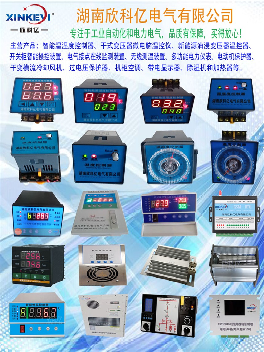多功能电力仪表、开关柜智能操控装置、智能温湿度控制器、电动机保护器、电气接点在线监测装置、干式变压器微电脑温控仪、新能源油浸变压器温控器、干变横流冷却风机、过电压保护器、户内高电压带电显示器、除湿机和加热器等。