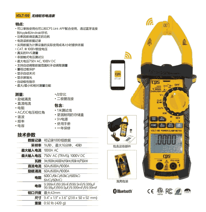 【美国CPS】CPS钳形表 VOLT-100无线电流钳形表 AC750数显钳形表