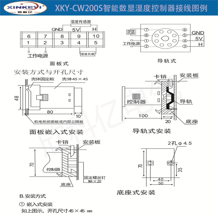 XKY-CW200S智能数显湿度控制器采用新一代传感器技术,进口高性能、精度高、寿命长高可靠的湿度传感器,集成电路和其它精密电子元件组成的电路能长期在各种自然环境下稳定可靠的工作。而具有灵敏性高响应速度快体积小寿命长,安装简便等特点。