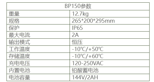 BP-150:内置三组48V/2AH的可充电蓄电池,可根据用户需求输出50V,100V,150V三挡直流电压,最大输出电流为2A,最大输出功率可达到300W,输出外带保险丝,方便更换。BP145支持多台串联或并联使用,可提供小功率以及更高功率输出需求,是组合使用方式非常灵活的一款电源产品。