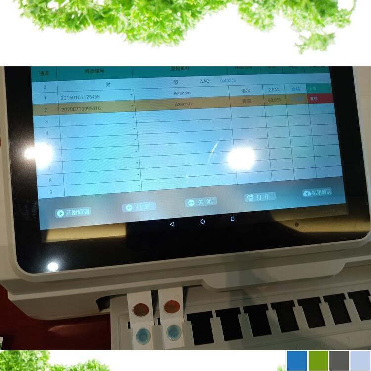 1、符合国标GB/T5009.199-2003,采用速测卡法检测,按照国标要求使用红色药片与白色药片叠合发生反应,进而判断样品农残是否超标,适用于国标要求的所有产品,需提供样机现场确认。