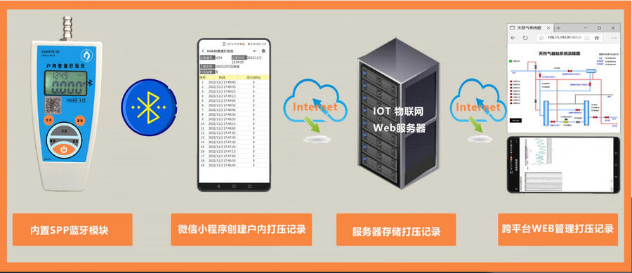 HH630是一种支持蓝牙通讯的压力记录仪,实现短距离和手机APP进行无线数据传输的功能。蓝牙通讯具有很强的稳定性,结合手机4G/5G的网络,可以将压力数据可靠的转储到服务器上进行存档,并提供完整的户内打压管理的整体解决方案。