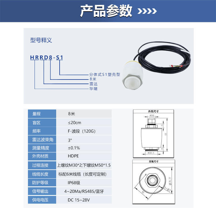 高精度是我们河道雷达液位计的核心竞争力之一。该产品利用先进的雷达技术,能够准确测量河道液位的变化。它采用多波束设计,可以避免地形复杂区域的盲区问题,确保数据的准确性。,我们还运用了先进的信号处理算法,有效地消除了杂散信号的干扰。无论是在污浊水域还是在恶劣工况下,我们的产品都能够稳定、精确地工作。雷达液位计采用HDPE全塑料外壳的设计方式,设备非常轻便易安装。尤其适用于在各种罐、池、仓等储体和河道等户内户外场合,具有非常好的适应性及抗干扰能力。现场显示并产生信号传给上位机或者综合控制站,以达到及时准确的判定和控制料仓情况。接口丰富,具有4-20ma电流输出及HART协议,具有RS485数字接口,蓝牙功能。