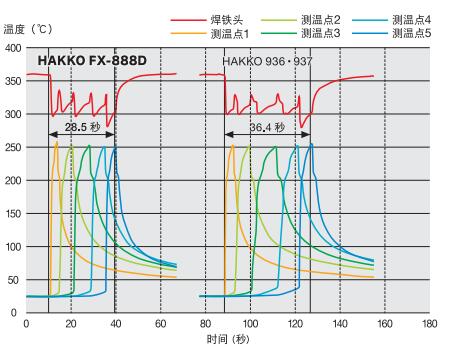 试验方法:在焊铁头上装热电偶,在酚醛纸镀铜膜叠层板上,用Φ1.6mm x 5mm焊锡丝,每3秒焊一个点,并测定焊接时焊铁头的温度。
