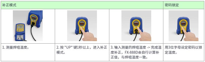 ●设有补正模式,补正温度简单容易;传统焊台需要仔细调节(CAL)旋钮来校正设定温度和焊咀实际温度的误差,FX-888D只需输入焊咀的实际温度就可以完成补正温度。
