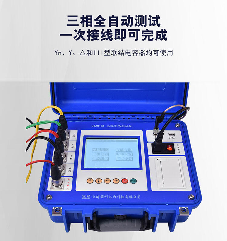 仪器具有三相电源输出及接口,可对三相Y型联结电容器、三相Yn型联结电容器、三相△型联结电容器、三相III型联结电容器进行一次接线,即可完成三相电容测试,并对分相电容分别进行测试计算,简单、方便,大大提高了现场使用人员的工作效率。