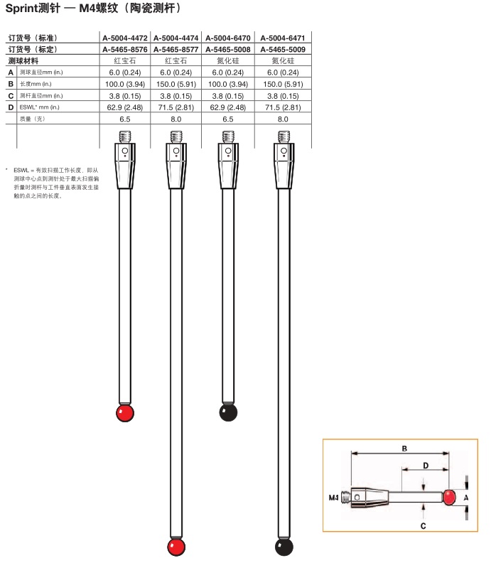 这是zui简单的一种测针,采用高球度的工业红宝石测球和备选的各种测杆材料。