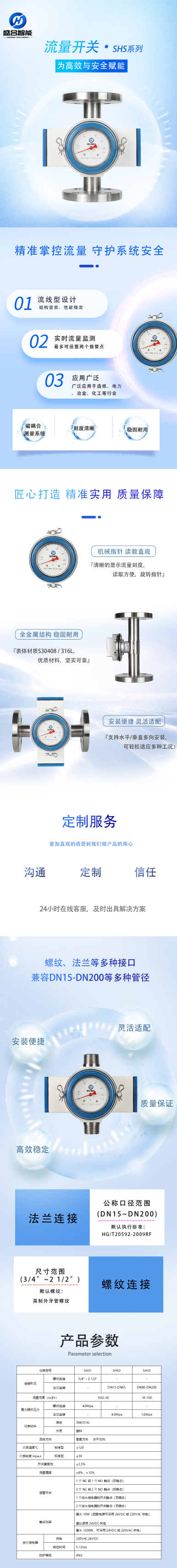 SHS流量开关采用锥形测量管和测量靶,当流体沿着锥形管通过时,测量靶依据流量的大小而产生位移,测量靶的位移,靠弹簧平衡力的作用而产生平衡,通过磁耦合系统传到指示系统,从而实现流量的监测和控制。