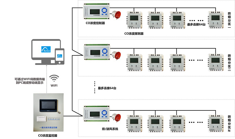 一氧化碳报警器采样电源及总线部分均有用无极性方式设计,总线采用抗干扰防静电保护电路,保证探测器长期稳定工作。一氧化碳质量比空气轻,气体探测器安装高度为1.5~2.0m处。当一氧化碳气体的浓度达到或超过设定报警值时,气体报警系统立即发出声光报警提示,同时可联动外接设备启动(电磁阀、排风扇、报警灯)。因地下车库安装一氧化碳气体报警器系统,是现今城镇建设必要的环节。能够有效抵制废气对我们人体造成的伤害,为我们建造健康的生活环境。