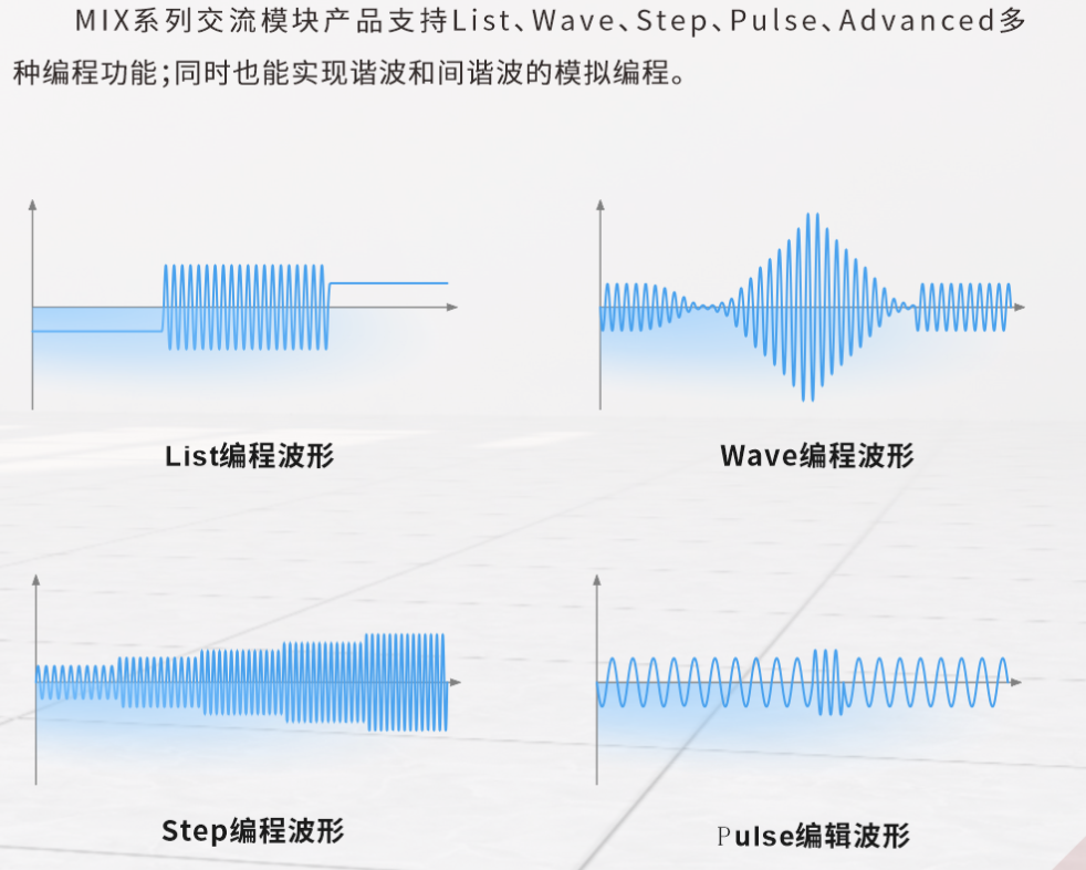 • 丰富的编程功能MIX系列交流模块产品支持List、Wave、Step、Pulse、Advanced多种编程功能;同时也能实现谐波和间谐波的模拟编程;支持100组自定义波形编程。