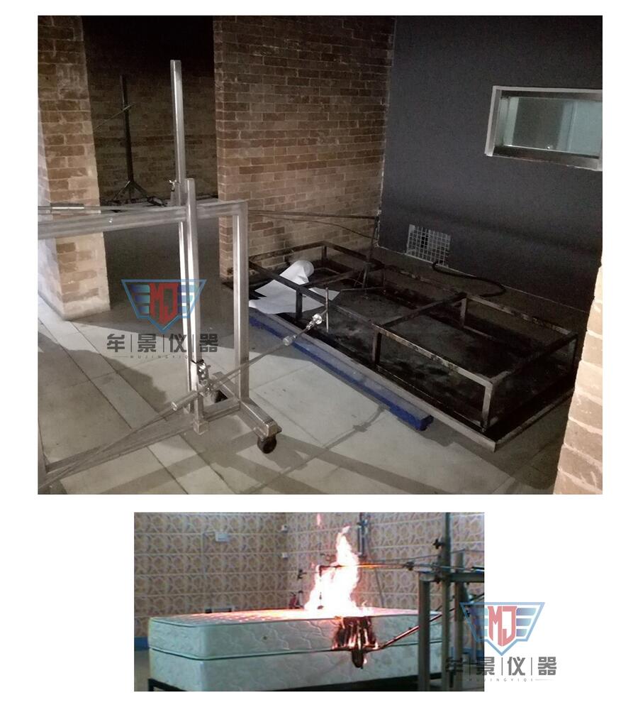 测试时床垫或床垫套件置于燃烧钢架顶部并对于两个总热量为27KW的T型燃烧器,侧面的燃烧器点火50秒,顶部燃烧器点火70秒。在不控制火焰的情况下,从样品中收集产生的烟气用气体分析仪器分析,热释放速率为规则连续的,热释放率峰值应不超过200Kw,在首10分钟总热释放应不超过15MJ