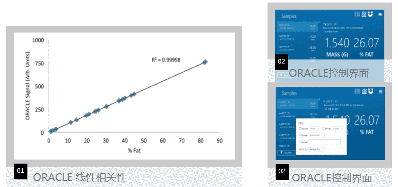 ORACLE是CEM新一代核磁专利检测技术——专门针对脂肪氢核的分离检测技术,超越目前普通NMR二次自旋回波共振技术,无法实现的直接脂肪检测能力。ORACLE可在NMR信号中分离出脂肪氢核进行检测计算,不再需要为不同的样品 建立不同的方法。