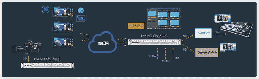 新维讯LiveMIX Cloud无限互联系统完全满足广大客户通过互联网互动制作的需求,可以大大节省制作成本,提高系统延展性,可以远程连接手机/摄像机并在演播室的环境下进行远程导播操作,从而节省了差旅成本并提高了流程效率。