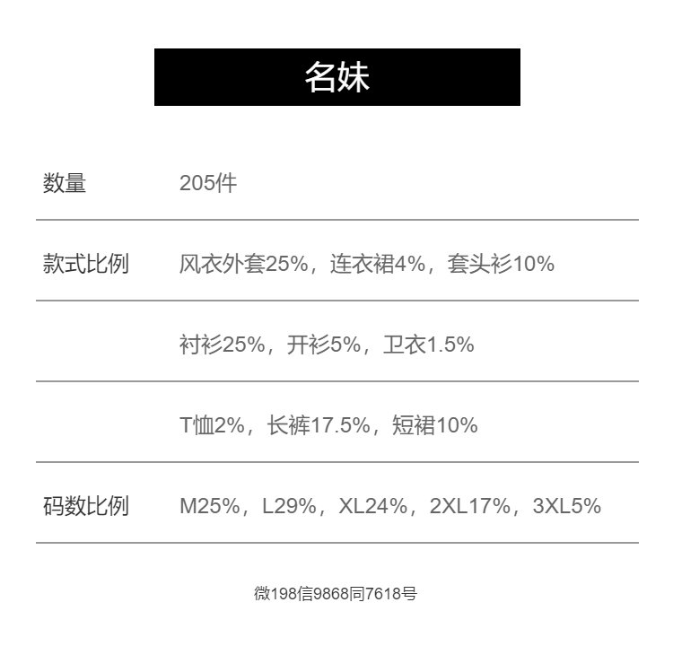 款式 | 风衣外套,连衣裙,套头衫,衬衫,开衫,卫衣,T恤,长裤,短裙 | ||