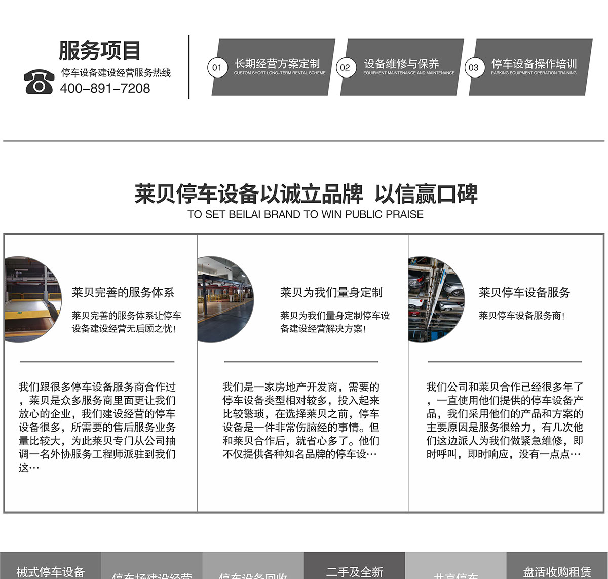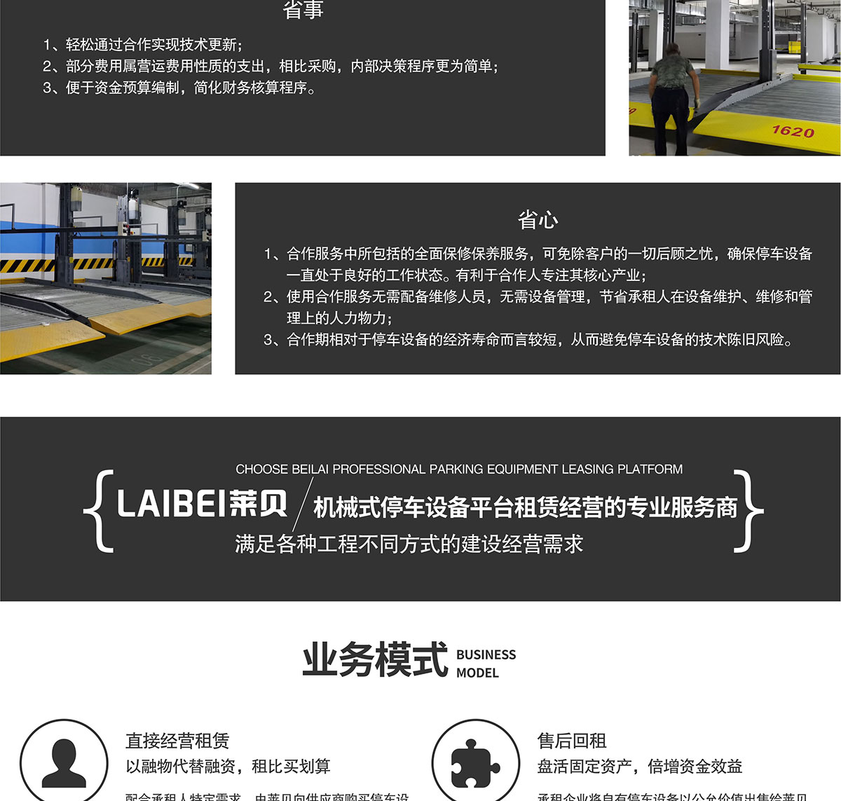 莱贝主营机械车位租赁 多层机械停车 机械停车位制作。国内正处于经济与建设发展阶段,目前已有国外多种停车设备出现在 上。停车装置种类繁多,通过详尽的技术分析及经济分析才可以有明智的决断,利用有利因素,建造出经济技术都合理的停车装置。总之,在我们面临着建设现代化大都市的重任和土地资源寸土万金的情况下,设计、生产和使用这一现代化设备是可行的、明智的选择。它的前景将是美好的。四、我们应该做些什么停车装置这一潜在市场也渐渐的明朗起来了,这给国内的企业经营者们增加了压力和动力,应联合科研、生产与使用者,共同推进这一高新技术产业的发展。去抢占这一新兴的市场。可以断言,将来这一市场的竞争是激烈的。现在仍是产品统一的规范和标准,这给停车系统的发展不利,这个问题亟待解决。扶植和发展这一产业,需要各部门乃至全社会的悉心呵护,才能让它可以健康发展壮大起来,的停车系统会成为一个新兴的产业,为社会、的现代化建设增添活力,将和各行各业相辅相成,成为一支不可忽视的产业力量!与同步,让我们的停车装置产品跻身行列。