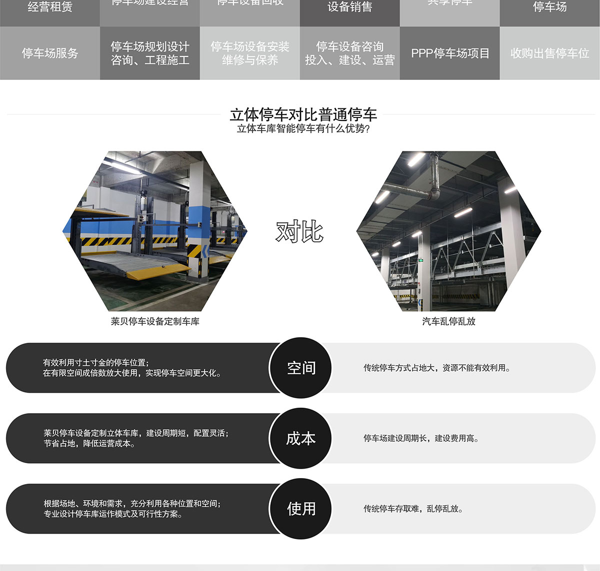 四川莱贝停车设备有限公司经营机械车位租赁、多层机械停车、机械停车位制作,随着许多人经济水准的增长,社会形态经济的进展,城市大多家子至少会有一辆车,况且闪现增长的发展方向,随之而来的就是城市停车难问题渐渐加剧,为了管用解决这个问题,立体停车场是个的挑选。既可以解决停车困难的问题,也可以让停车智能化,立体化,这也是术进步的一种表现出来,城市进展的一种表现出来。那里面在立体停车设备中上升下降横移立体停车设备是援用更为的一种停车形式,其上升下降横移立体停车设备占地平面或物体表面的大小小,停车位多,建设成本不高,因为这个遭受人们的。上升下降横移式立体停车设备的公原理:上升下降横移立体停车设备本设备共有地上上、中、下三层、地下负一层,那里面下层及中层需求空一个车位,能够左右横移,作为交换车位;及中层及地下负一层车位可以上下上升下降。需求存取中车位时,判断该车位是否已经落下到地面,若不在地面,保中每个车位都务必升涨到顶点部位置,地下一层车位减退到尽头部,然后,中层及下层车位左右横移,在需求落下的车位正下方形成一个上升下降通道,车位自由落下至地面,成功实现存取担任的工作。同理,需求存取地下一层车位时,判断该车位是否已经升涨到地面,若不在地面,保中每个车位都务必升涨到顶点部位置,然后移动下层车位,空出操作车位的正上部车位,将目的车位升涨至地面,完成存取操作。主要有:机械车位租赁、多层机械停车、机械停车位制作、简易升降式、升降横移升降式等。该产品具有占地面积少、空间利用率高、安装方便、能耗低、噪音小等特点,适用于各种场地和建设要求。公司为客户提供立体车库规划计划、施工设计、安装调试、运营培训、技术支持售后、机械停车设备销售、租赁、回收等多项服务。