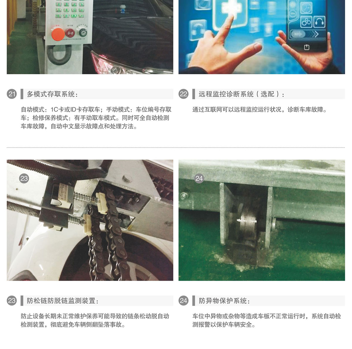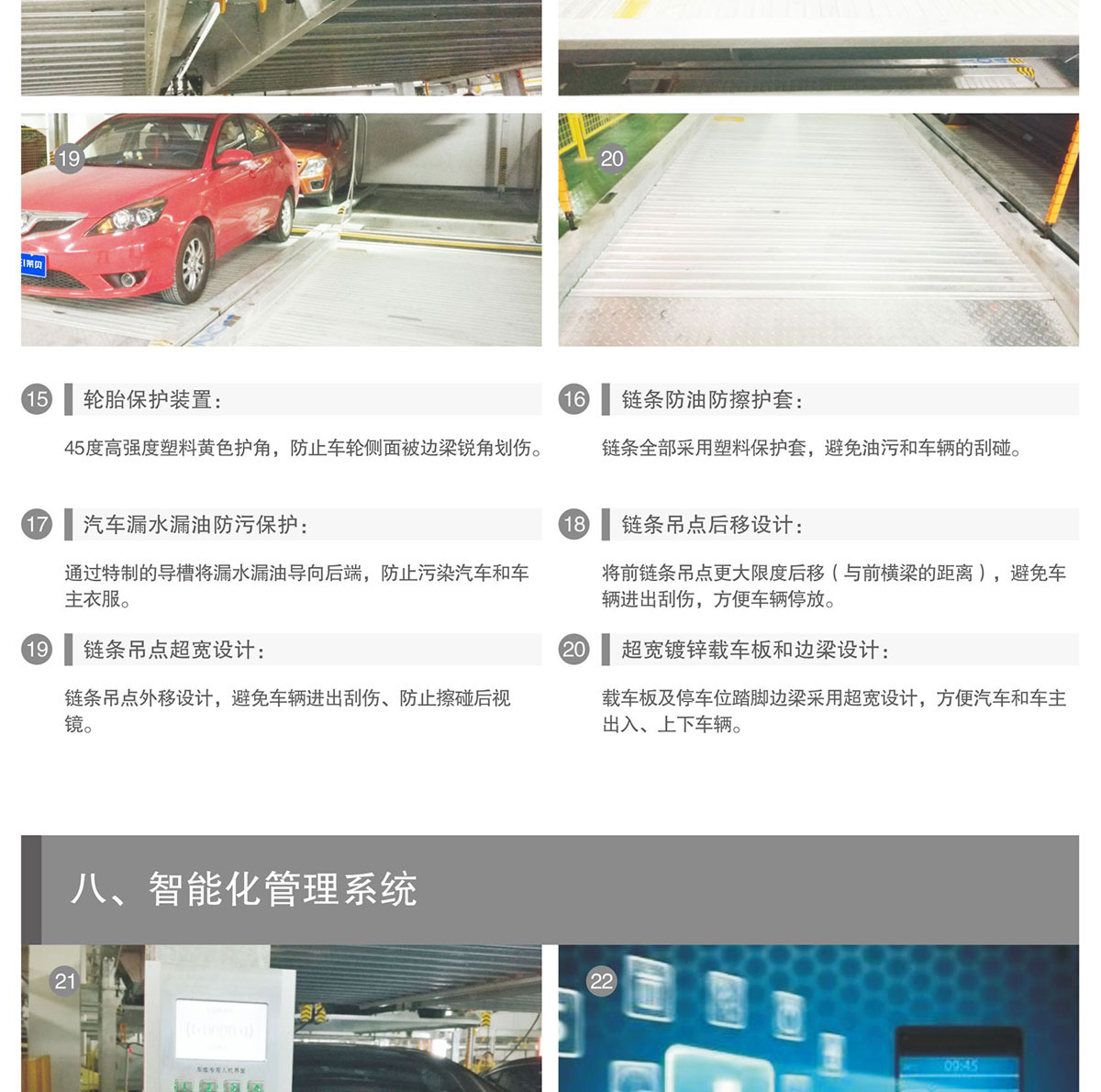 立体停车库有哪些保障安全的防护设置1)轿车开上转盘后,为了轿车停止的位置正确,有机械机构进行纠偏动作,把车辆摆正。2)轿车在转盘停止后,有轿车的三维、超宽检测,车辆的外轮廓线车位空间。3)升降机与转盘对接后,有对准检测,是在对准的情况下才能进行车辆交接。4)升降机有安全防坠装置和安全钩,车辆在升降方向在任何情况下不能下坠。5)升降机的立柱上下两端安装减速、限位检测开关,升降过程不运行范围。6)输送小车的运行方向两侧,安装车门打开检测,输送小车运行过程中,出现车门打开的现象出现。7)输送小车与货位对准有对准检测,在对准的情况下,车辆才能进行存储。8)输送小车运行方向的两端,安装减速、限位开关,运行过程中不运行范围。9)输送小车的正对货位的两端,安装有货位车辆检测开关,在货位内有车辆,不进行入库。10)输送小车的中间位置安装检测是否载有车辆的检测开关,输送小车在载有车辆、进行出入库动作的时候才能接收出入库命令。11)在每一层货位,都安装有货位检测开关,输送小车在运行的过程中,对载有的车辆和货位内的车辆出现干涉进行检测。12)货位的载车板安装有导污槽,车辆漏油、车轮泥水等留下,污染下层车辆。13)货位安装有安防检测系统,车辆出现自燃时,及警或者喷水。14)层移小车上安装有无线头,在出入库过程中,有影像进行和查看。15)系统设计了备用输送小车、备用升降机、备用发电机,车辆能够全天候进行存储。16)一旦设备出现故障,可以手动操作设备把车辆从库内取出。17)立体库区顶上和四周安装防尘罩、周边安装防护栏,在适当位置设置声光指引。18)监控系统中设计了故障报警指示和解决办法,让操作人员能够及时处理故障。