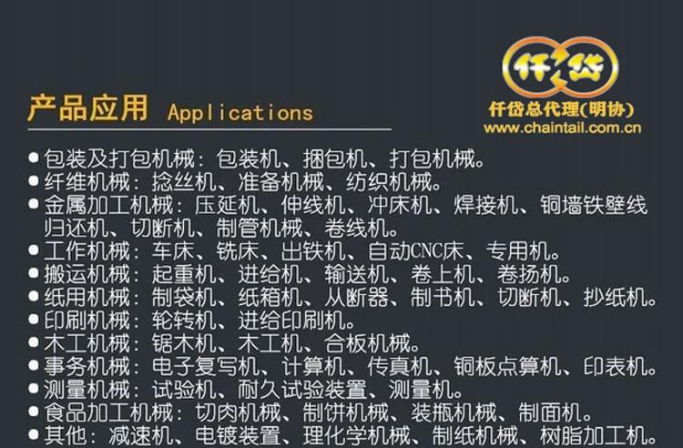 台湾仟岱(广州)有限公司 主要代理经营仟岱电磁离合器、仟岱电磁刹车器、仟岱电磁制动器、仟岱磁粉式刹车器、仟岱磁粉式离合器等产品。品种齐全、质量可靠、供货稳定、价格实惠!此外也提供为客户量身定制产品的服务。 台湾仟岱产品在设备材料方面使用了优质导磁率的材质,来令片使用摩擦系数高,底摩耗的高等级非石绵来令片,提高产品的应答时间及产品的使用寿命。 在性能方面主要突出:高速应答、耐久性大、组装维护容易、不需要进行磨耗调整、动作确实,可以进行扭力调整。产品广泛应用于木工机械:如中板拼板机,锯木机,合板机械等。