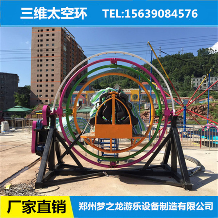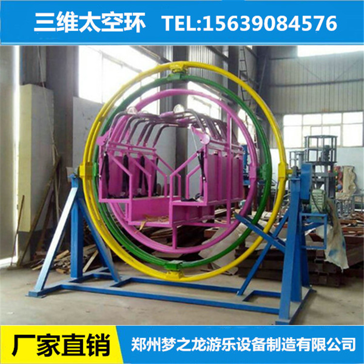“三维太空环”是由训练飞行员和宇航员的模拟装置演变而来的游乐设备。根据制造工艺的不同可分为单环和双环两种。游客面对面坐在设备最内环的黑色座椅上,该产品带着游客360°旋转,速度时快时慢,三维太空环可使乘客体会到三维空间自由旋转的特殊感受,乘客可完全放松全身肌肉,既锻炼身体又趣味无穷。