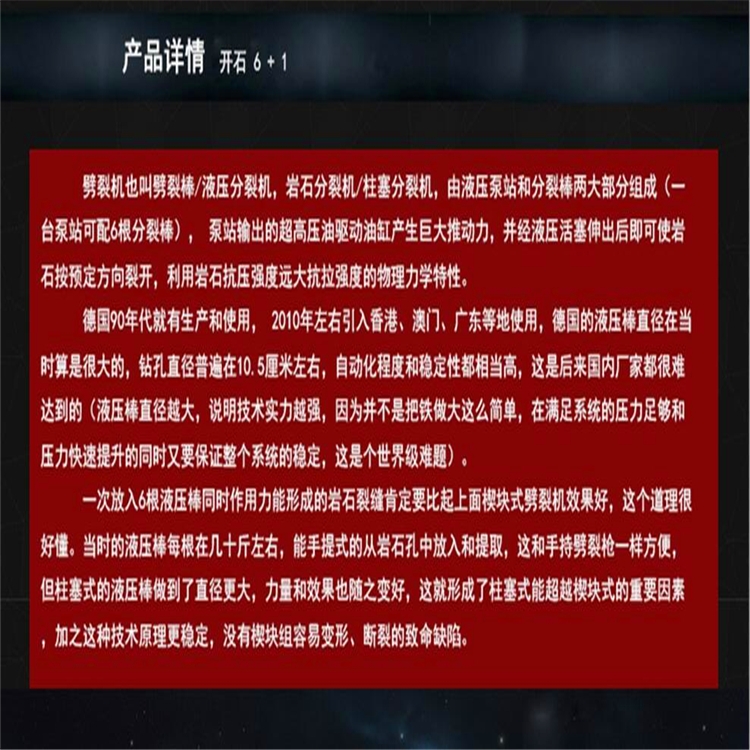 40MPa400kg/cm)的压力就能产生5000吨力(目前国内经过市场检验达到这个技术参数的设备仅一家生产),利用岩石的抗压强度高、抗拉强度低的特性,将岩石内部结构达到的效果。据性试验数据显示:在莫氏硬度大于7的岩石上,拆除效率是破碎锤的5倍以上