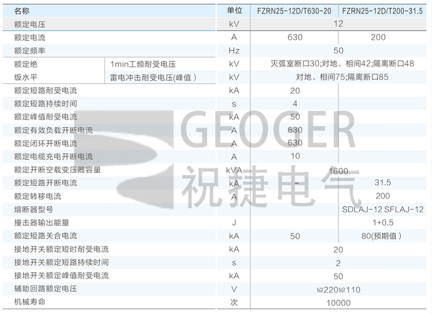 FZRN25T2D/T200-31.5型户内高压真空负荷开关-熔断器组合电器(以下简称组合电器)是三相交流50Hz、额定电压12kV的户内装置,适用于工矿企业配电所及变电站等场合,作负荷控制和短路保护之用。它还具有关合短路电流能力的接地开关。其操作机构可手动和电动,便于实现电力系统的三遥控制要求。