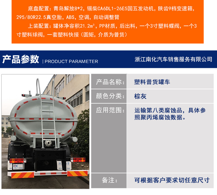 浙江南化 20t塑料运输槽罐 槽罐车 全塑普货罐车 全塑供液车