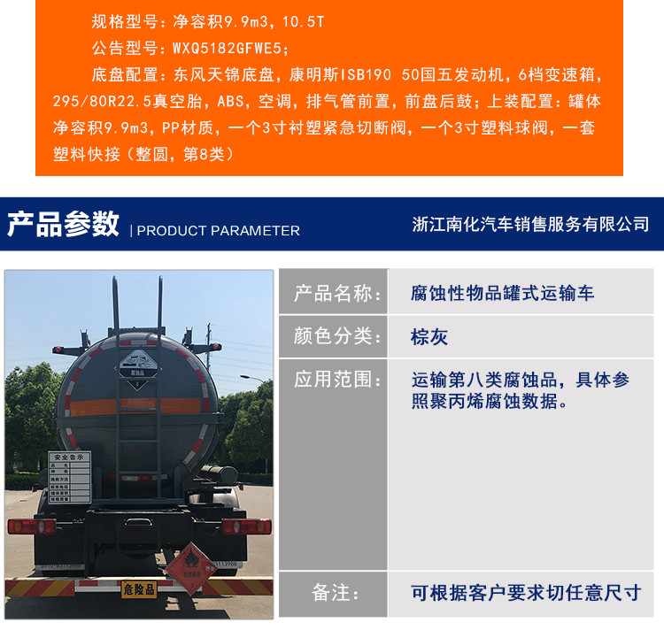 机电之家网厂家浙江南化防腐设备有限公司为您提供浙江南化 10方盐酸槽罐车 液碱 次钠 化工液罐车 腐蚀品液罐车的详细产品价格、产品图片等产品介绍信息,您可以直接联系厂家获取浙江南化 10方盐酸槽罐车 液碱 次钠 化工液罐车 腐蚀品液罐车的具体资料,联系时请说明是在机电之家网看到的。