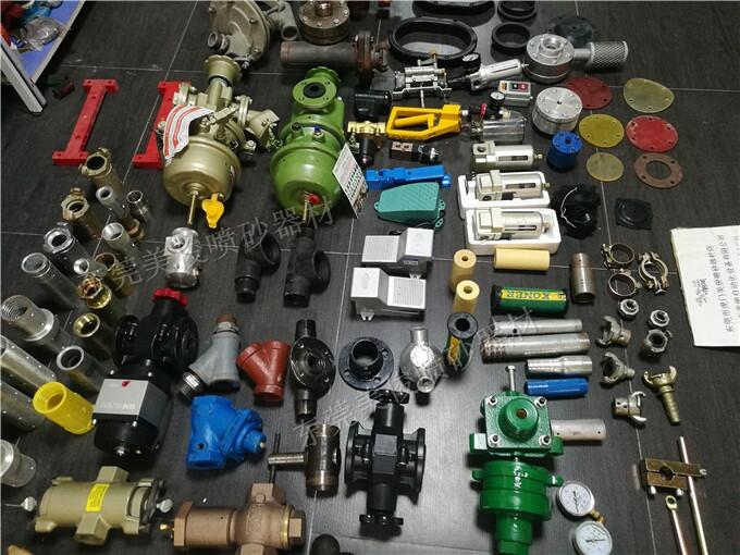 喷砂机配件包含:诸如各式喷砂枪,各式喷砂嘴,喷嘴套,调砂阀,进气阀,排气阀,除尘风机,喷砂帽,喷砂服,喷砂手套,温度调节器,呼吸过滤器; 高压喷砂管,吸砂管,埋吸管,空气管,