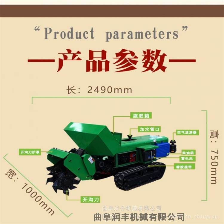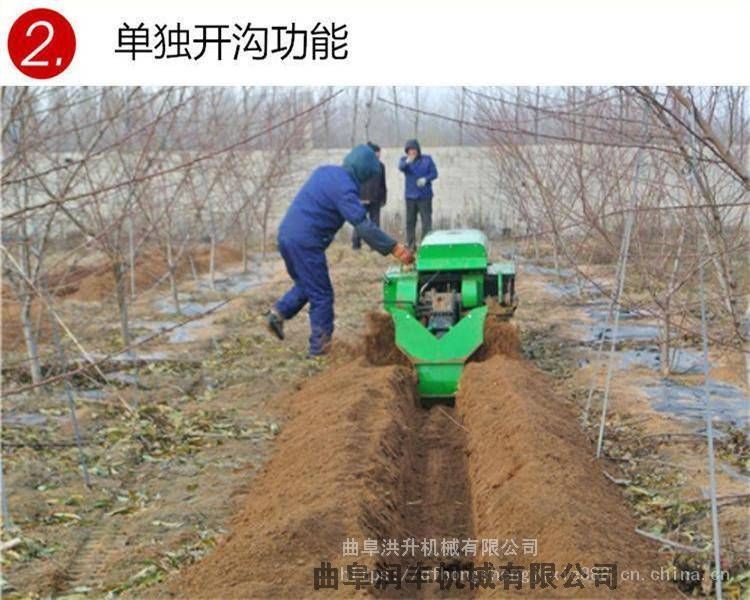多功能履带式开沟施肥机安装上不同的配件可以进行单独旋耕、回填、单独开沟、施肥、也可混合搭配使用。产品结实,性能优越,操作方便.:机身加厚,密,履带式行走,可进行原地转向。刀具都是加厚75号猛钢锻造,非常耐磨,工作效率高。主要五大功能:开沟施肥自动回填一次性完成(化肥)、单独开沟施土杂肥、单独除草、更换回填和旋耕装置后可进行回填和旋耕作业,该机体积小,重心低,操作灵便,适用于果园葡萄、果树、枸杞、蓝莓等经济作物的开沟施肥作业