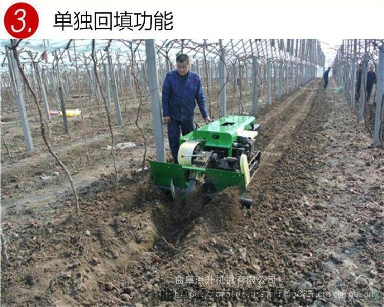多功能回填机本机适用性强:适用各种山地,丘陵、平原、旱田、大棚、果园、及狭窄地作业,省心。适合各种土质:冻土、硬土、粘土、黑土地,山地,软土均可使用. 履带式开沟施肥机可以实现大型机械无法进入的果园、小块土地、大棚、茶园、丘陵、山地等不同的地形和土质进行作业。