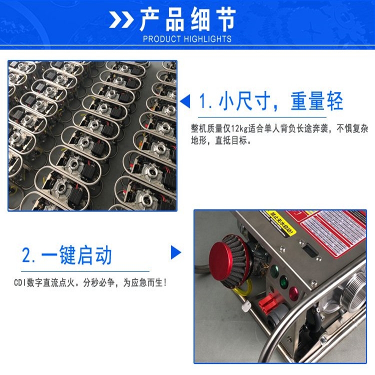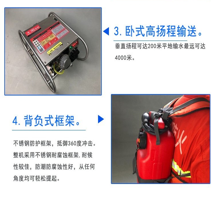 三级离心泵,泵体与泵叶采用航天高强度防腐铝合金,单缸两冲程风冷发动机,发动机电子点火,M高转速8000转/分。发动机配有发明的电子超速切断自动保护复位装置,发动机汽缸为内壁镀铬铝合金,泵体与发动机组装后,重量轻于14.2kg。发动机使用寿命不低于3200工作小时。引水泵:真空度大于56Kpa,26秒内可引水充满吸水管。水路配件:所有水路配件工作压力24巴,测试压力42巴,铸铝合金均有阳极电镀防腐处理。25升带背包的油箱。