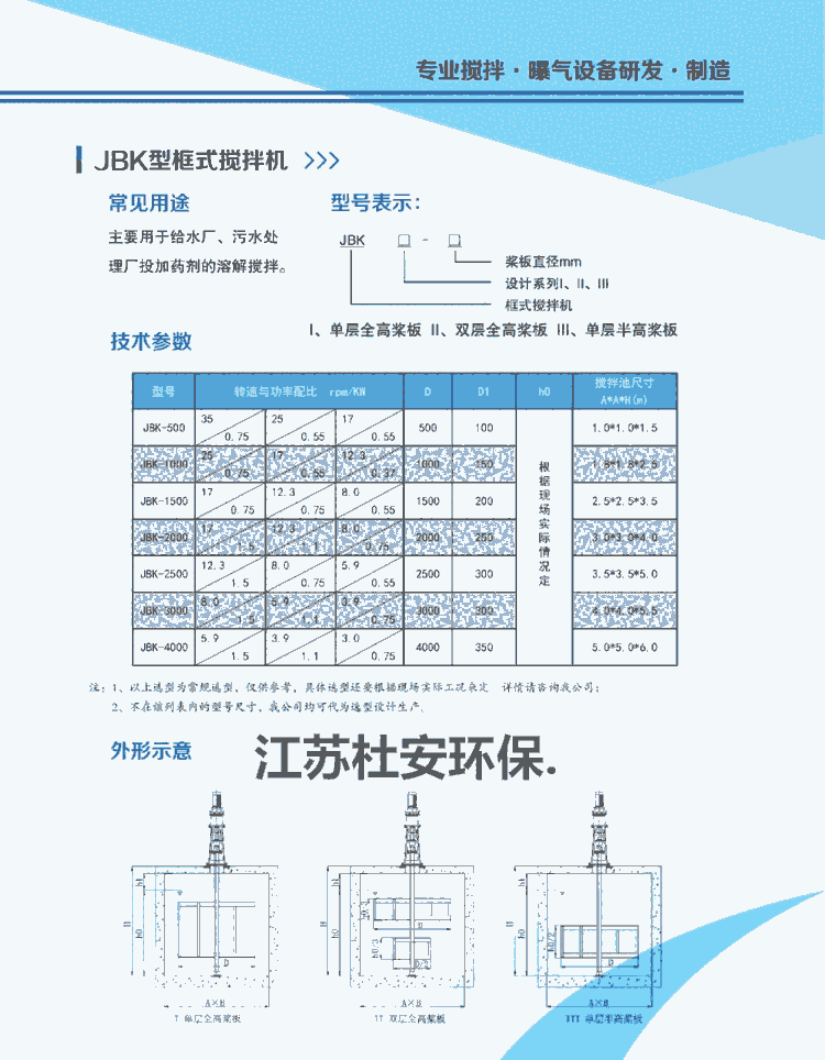 江苏杜安环保絮凝池搅拌机由电动机、立式减速机、机架、联轴器、主轴、浆板和水下轴承等组成。当电动机接通电源后经过减速机减速,由联轴器把扭矩传递给搅拌机主轴带动浆板转动,从而搅拌液体。