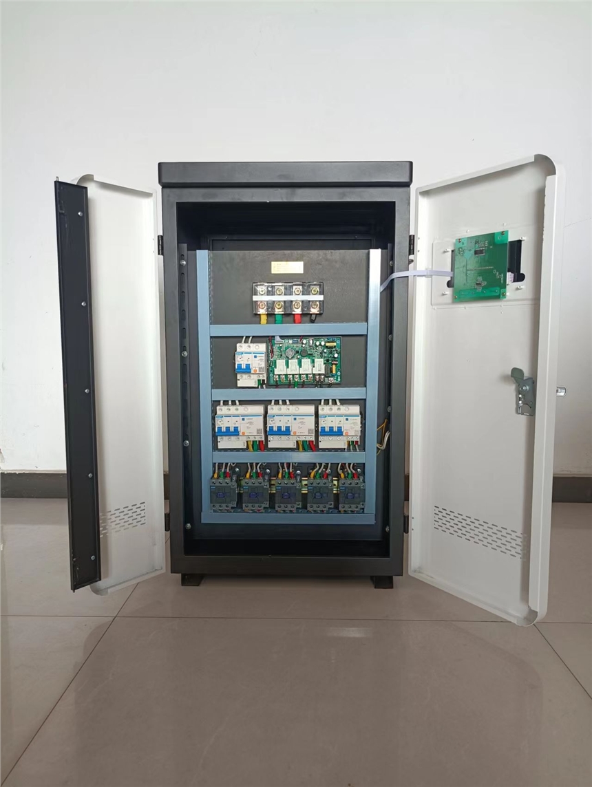 2、电气电路设计采用交流接触器控制,实现负载电路与控制电路的结合,避免冲击电流对智能控制器的影响,运行稳定;每组设置10KW,有单独的交流接触器与带漏电保护的空开实现每路控制,可通过操作界面调节功率档位,也可通过手动控制空开来实现功率调节;
