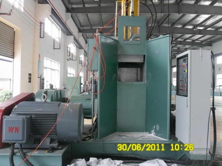 5、提起上顶栓,将已切成小块的生胶从加料口投入密炼机,落下上顶栓