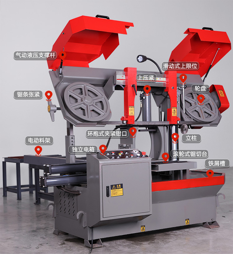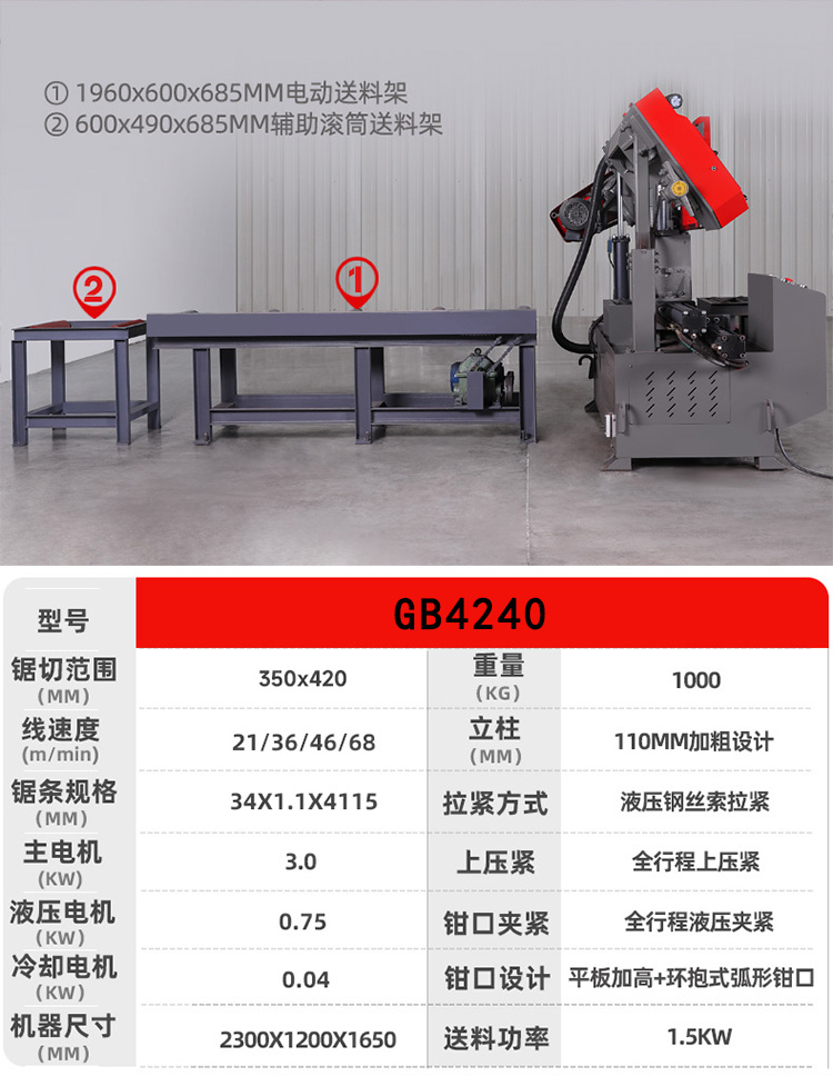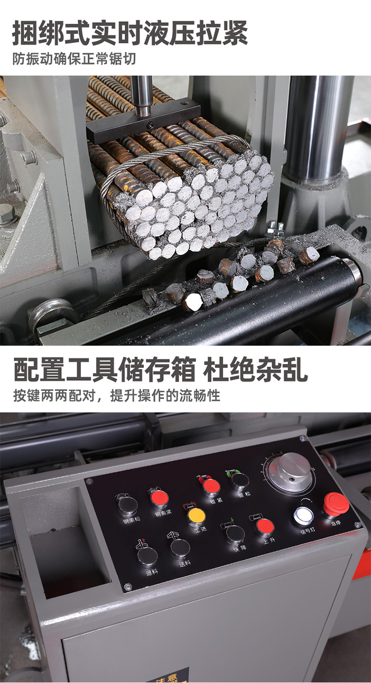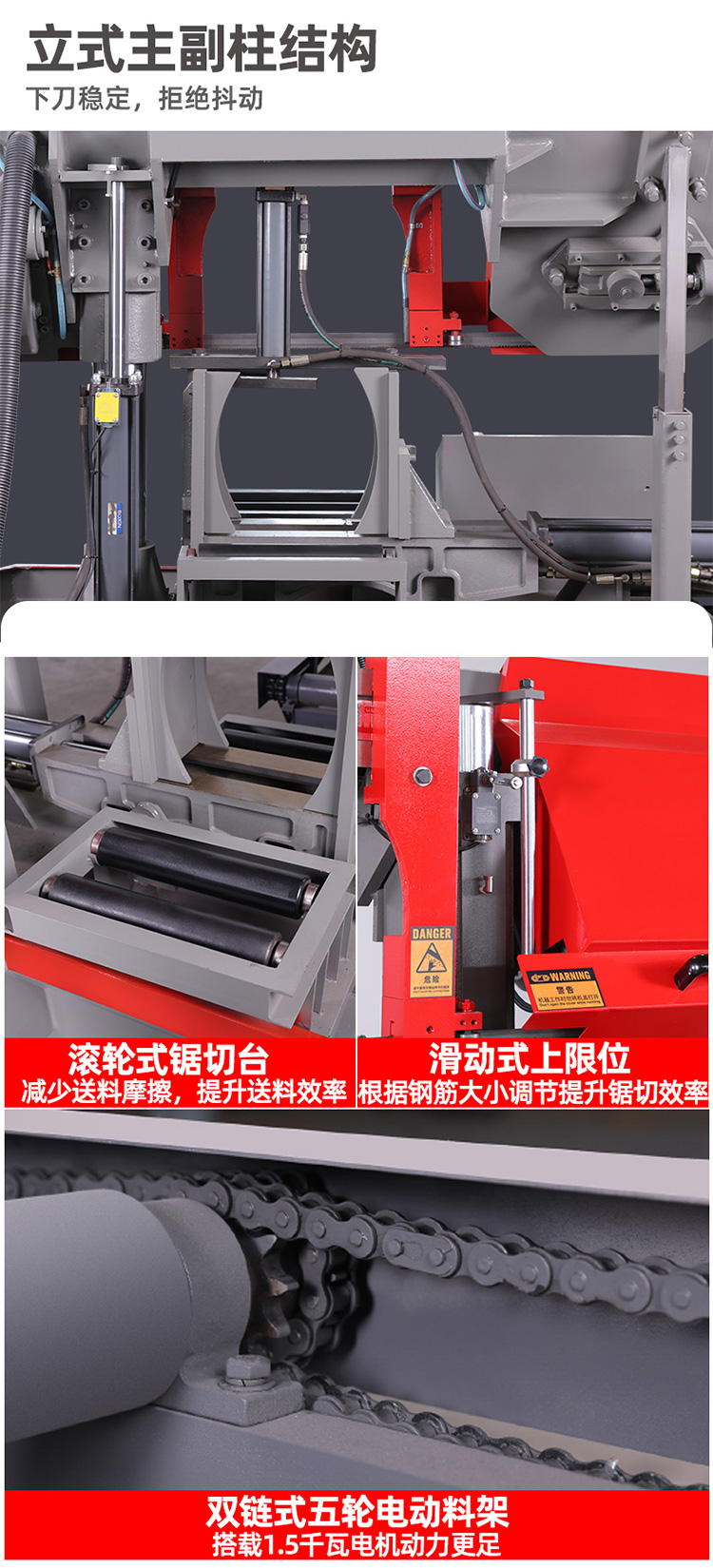 4240数控锯床主要特点: ※ 彩色屏式控制面板,锯切参数数字设定,故障参数提示; ※ PLC可编程控制器,灵活设定,转变锯切,手动和自动结合; ※ 切割完成或无料时自动停机; ※ 双立柱+升降油缸结构,垂直升降,性高; ※ 切削速度液压控制,无级变速; ※ 三向液压,锯切时工件性高; ※ 液压式双夹钳设计,液压夹钳送料; ※ 工件未,锯条无法启动安全装置,避免锯条损坏; ※ 锯切长度设定数字显示表,小设定刻度0.1mm; ※ 锯切时,锯条意外断开或卡住后,设有保护装置,可以自动停机; ※ 适用于批量材料锯切。 钢筋带锯床 数控液压钢筋专用带锯床 工字钢水锯床。
