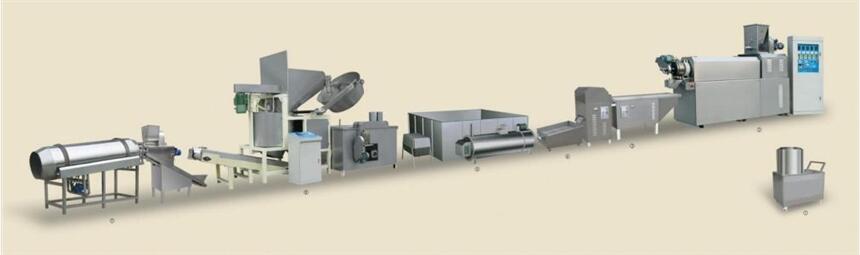 拌粉机→双螺杆膨化机→整形切断机→自动油炸机→八角筒→(包装机)