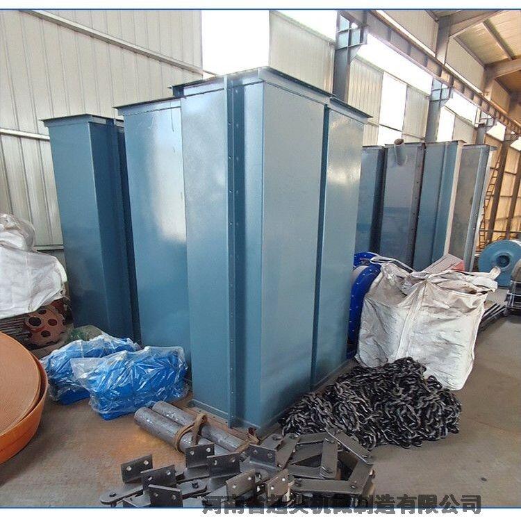 1、上部装置:安装有轨道(双排道),防止链条摆动,逆止器,防止料斗回转,物料阻满下部机壳,卸料口装有橡胶板防止回料。