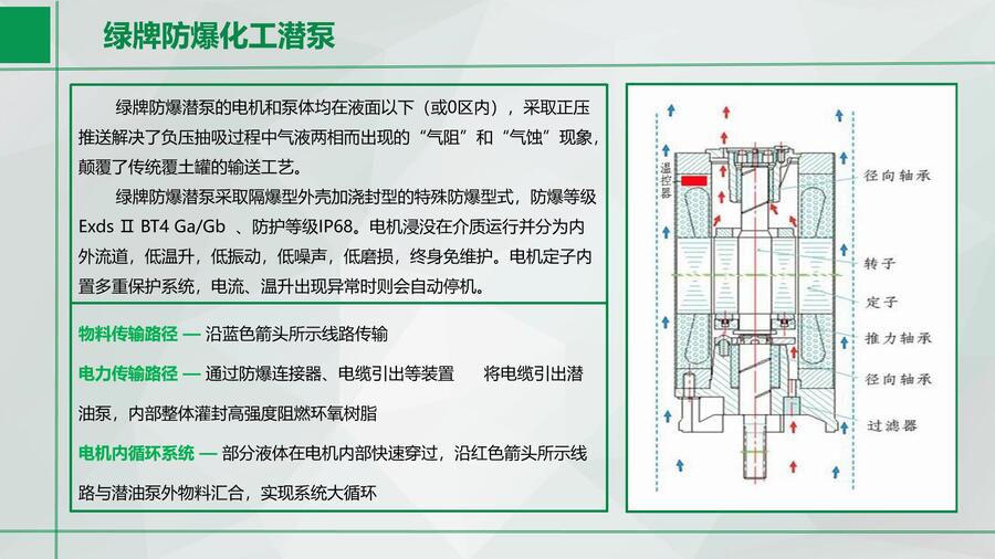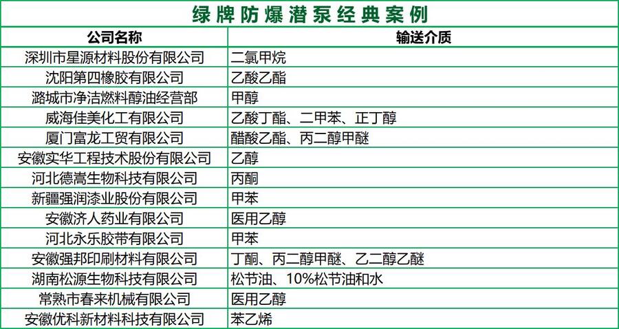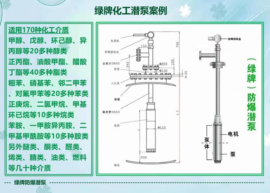 绿牌防爆潜泵可适用180种化工介质,不可输送酸、碱、盐腐蚀性介质。