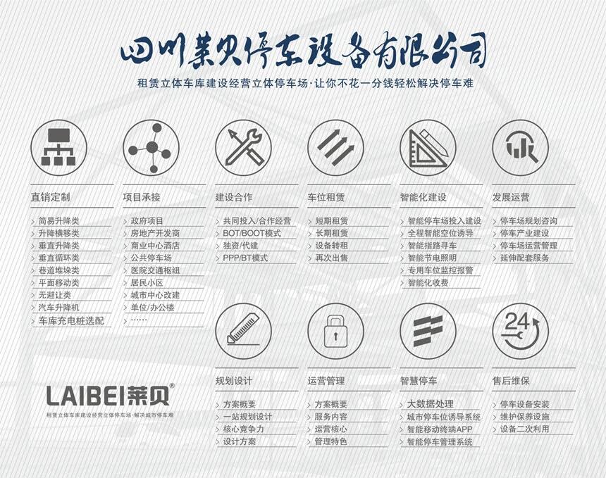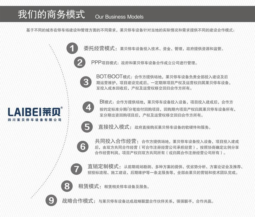 四川莱贝停车设备有限公司致力于四川阆中立体车库租赁、停车立体设备、莱贝立体停车位出租、机械停车设备销售、机械式立体车库设备经营租赁、立体停车场建设、停车场经营管理、停车场规划设计、停车场施工建设、共享停车、盘活停车场、收购停车场、租赁停车场、收购停车位、出售停车位、停车资产管理及互联网停车软件开发车主服务等领域。我们为机场、车站、商场、大学、住宅、酒店、P+R停车等各种停车类型,从一个停车场一个区域到一个城市提供的停车位经营解决方案。公司严格按照ISO9001:2015质量管理体系、ISO14001:2015环境管理体系、ISO45001:2018职业健康安全管理体系要求,优化组织架构,规范内控体系,明确部门分工,积极开拓市场。业务特色鲜明,在市场营销、风险控制、业务创新、人力资源管理等方面均衡发展,形成覆盖全国的业务网络,建立了科学的管理模式。公司与多家机构、设备制造商、服务团队、停车管理等多家企业形成战略合作关系,抓住历史机遇,创造奇迹,在尽可能短的时间内,做大做强做牌。通过持续改进,不断设计并优化停车场方案,为客户提供多元化的立体停车场经营以及技术支持服务,致力于成为国内更具创新力的立体停车场经营提供商。为了响应快速发展的停车需求和引入社会资源优化停车产业结构的号召,莱贝停车设备配合政策,改善车主停车体验,解决城市停车难题,将未来停车产业推向新的领域。公司充分利用人才、技术和设备优势,租赁一系列适合国情的、高的产品。主要有:四川阆中立体车库租赁、停车立体设备、莱贝立体停车位出租、简易升降式、升降横移升降式等。该产品具有占地面积少、空间利用率高、安装方便、能耗低、噪音小等特点,适用于各种场地和建设要求。公司为客户提供立体车库规划计划、施工设计、安装调试、运营培训、技术支持售后、机械停车设备销售、租赁、回收等多项服务,直至客户满意。