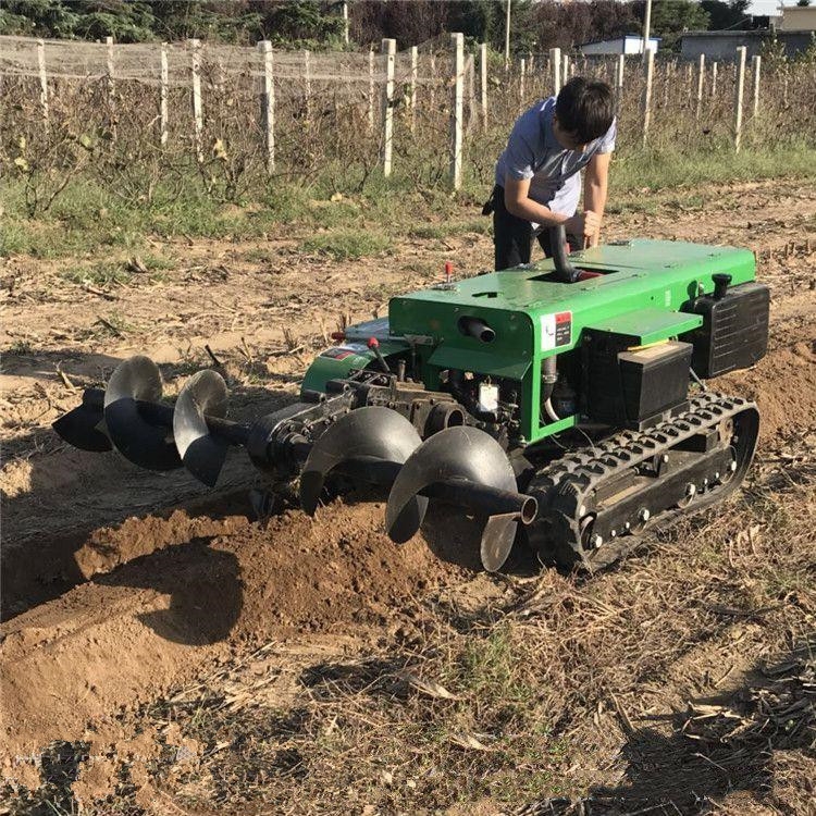 多功能履带式开沟施肥机安装上不同的配件可以进行单独旋耕、回填、单独开沟、施肥、也可混合搭配使用。产品结实,性能优越,操作方便.:机身加厚,密,履带式行走,可进行原地转向。刀具都是加厚75号猛钢锻造,非常耐磨,工作效率高。主要五大功能:开沟施肥自动回填一次性完成(化肥)、单独开沟施土杂肥、单独除草、更换回填和旋耕装置后可进行回填和旋耕作业,该机体积小,重心低,操作灵便,适用于果园葡萄、果树、枸杞、蓝莓等经济作物的开沟施肥作业
