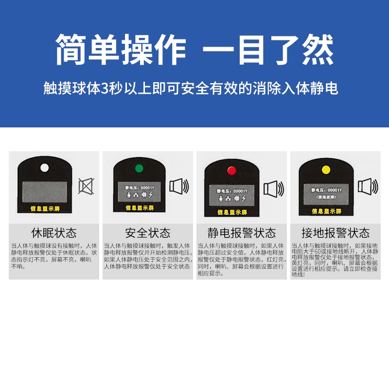 澳波泰克人体静电释放报警仪,用于解决石油化工危险场所中操作人员作业静电安全问题,在导除静电的同时检测人体电压,当电压值高于150V时,发出声光报警提示。其触摸球采用静电亚导体材质,不会产生电火花,目前已普遍替代了传统的不锈钢导静电产品。