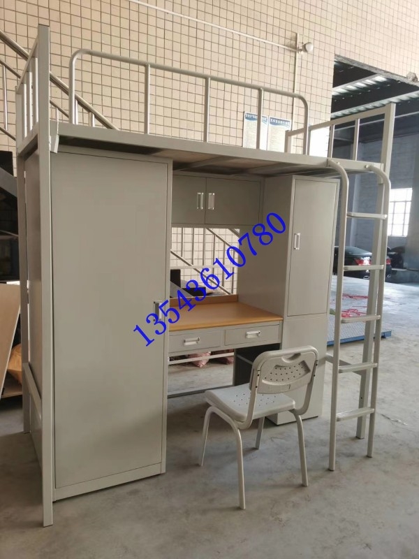 学生连体公寓床是由床、书柜、衣柜、书桌和梯架组成。书柜和衣柜连接在床架床腿内侧,书桌将书柜、衣柜连在一起。由于床是立体空间组合,不仅节省了空间,而且整齐美观