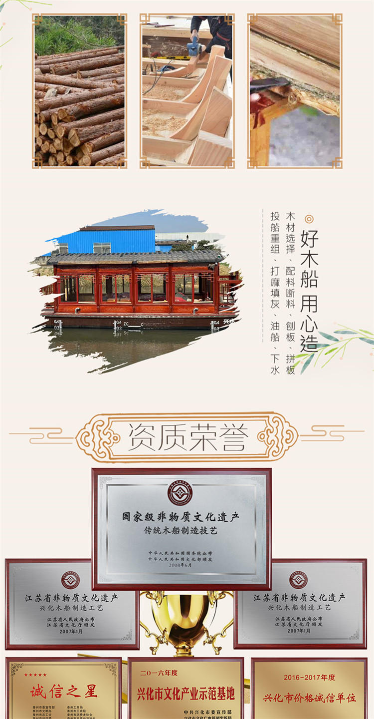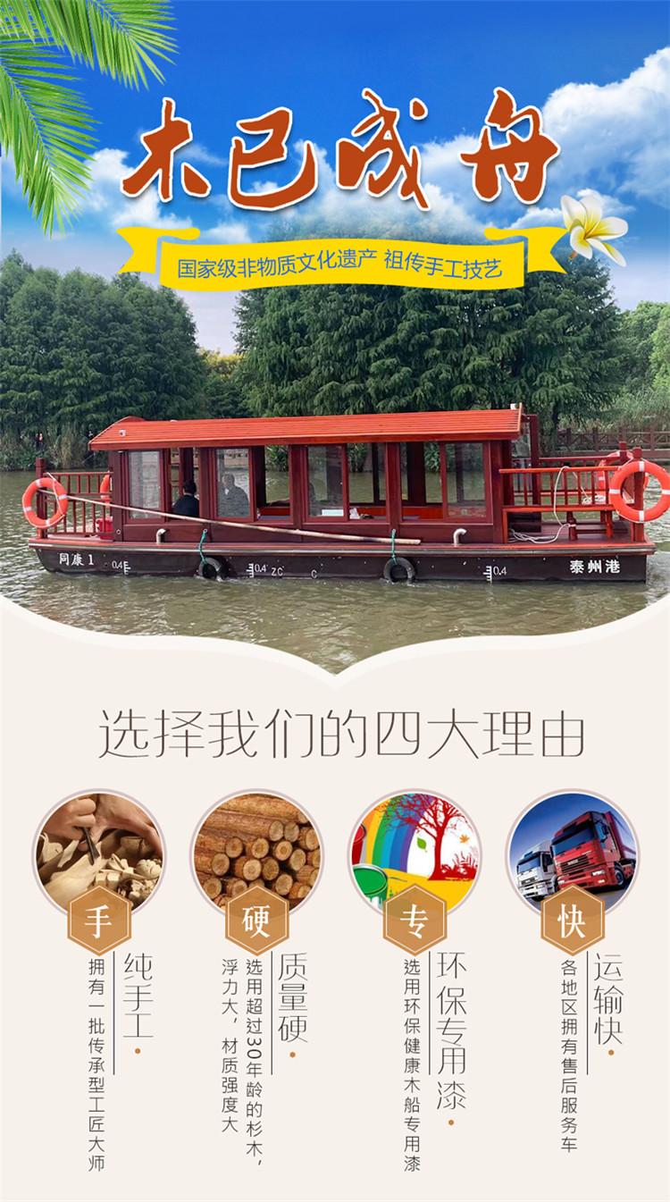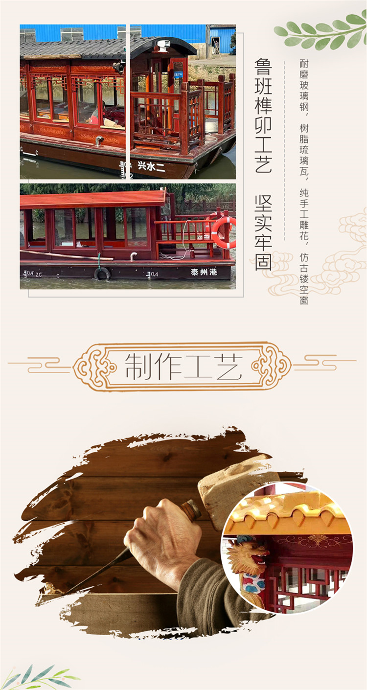 厂家批发单层画舫船电动仿古8米餐饮船玻璃钢船体观光船