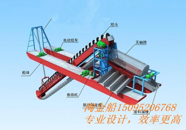 本淘金船是专为复杂河床条件下开发设计的专业化淘金设备。淘金设备为目前先进的皮带溜槽式提金装置,黄金提取效率高。船体为轻钢框架结构,极易拆装,便于运输,采用高强度塑胶浮体,更符合环保要求。